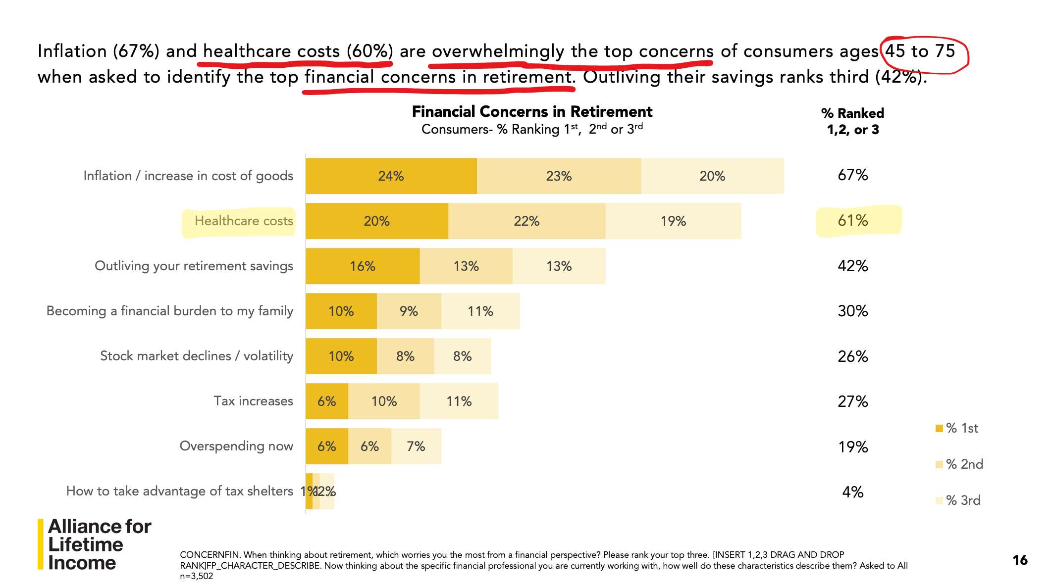 Just this year, Alliance for Lifetime Income by LIMRA’s 2025 Protected Retirement Income & Planning study found that consumers who work with a financial professional cite healthcare costs as their second-highest worry in retirement (62%). Meanwhile, financial professionals listed healthcare costs third (50%) in clients’ top concerns.